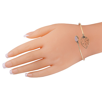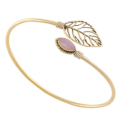 Home | Fashion Bangles | Brass Gemstone Bangles | Gorgeous Leaf Work Around Rose Quartz Marquise Shape Solid Brass Bangle