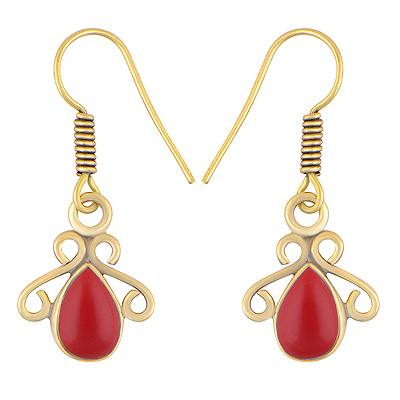 Home | Fashion Earrings | Brass Gemstone Earrings | Stunning Wire Pattern Around Coral Pear Shape Solid Brass Dangle Earrings