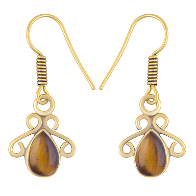Home | Fashion Earrings | Brass Gemstone Earrings | Stunning Wire Pattern Around Tiger's Eye Pear Shape Solid Brass Dangle Earrings