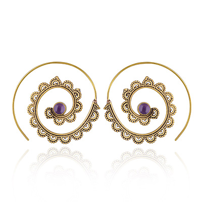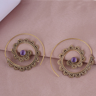 Home | Fashion Earrings | Brass Gemstone Earrings | Stunning Rawa Work Pattern Around Amethyst Round Shape Solid Brass Spiral Earrings