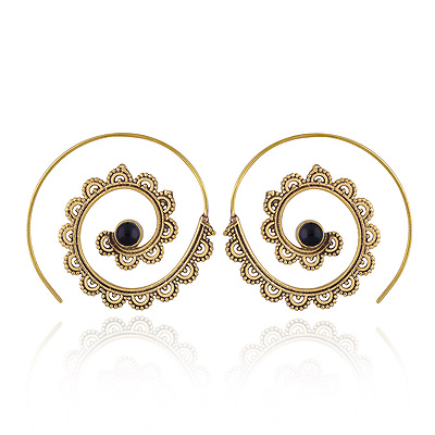 Home | Fashion Earrings | Brass Gemstone Earrings | Stunning Rawa Work Pattern Around Black Onyx Round Shape Solid Brass Spiral Earrings