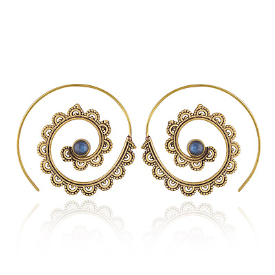 Home | Fashion Earrings | Brass Gemstone Earrings | Stunning Rawa Work Pattern Around Labradorite Round Shape Solid Brass Spiral Earrings