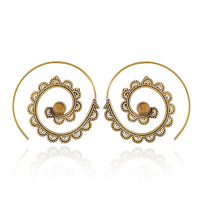 Home | Fashion Earrings | Brass Gemstone Earrings | Stunning Rawa Work Pattern Around Tiger's Eye Round Shape Solid Brass Spiral Earrings