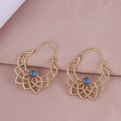 Home | Fashion Earrings | Brass Gemstone Earrings | Gorgeous Lotus Pattern Around Labradorite Round Shape Solid Brass Hoop Earrings