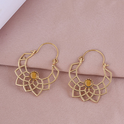 Home | Fashion Earrings | Brass Gemstone Earrings | Gorgeous Lotus Pattern Around Tiger's Eye Round Shape Solid Brass Hoop Earrings