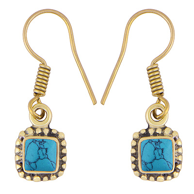 Home | Fashion Earrings | Brass Gemstone Earrings | Stunning Rawa Work Around Turquoise Square Shape Solid Brass Dangle Earrings