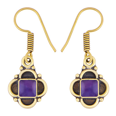 Home | Fashion Earrings | Brass Gemstone Earrings | Beautiful Oxidised Flower Work Around Amethyst Square Shape Solid Brass Dangle Earrings