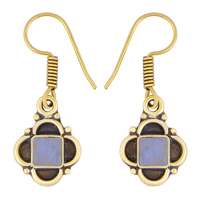 Home | Fashion Earrings | Brass Gemstone Earrings | Beautiful Oxidised Flower Work Around Rainbow Moonstone Square Shape Solid Brass Dangle Earrings