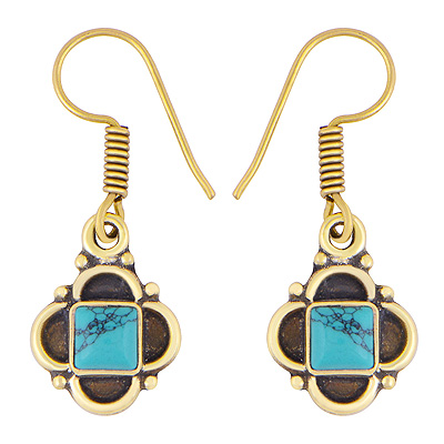 Home | Fashion Earrings | Brass Gemstone Earrings | Beautiful Oxidised Flower Work Around Turquoise Square Shape Solid Brass Dangle Earrings