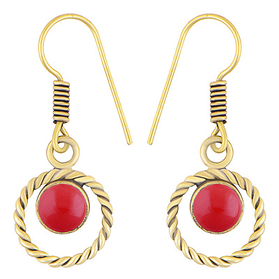 Home | Fashion Earrings | Brass Gemstone Earrings | Beautiful Twisted Wire Circle Around Coral Round Shape Solid Brass Dangle Earrings