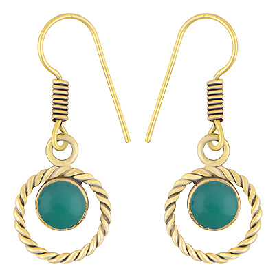 Home | Fashion Earrings | Brass Gemstone Earrings | Beautiful Twisted Wire Circle Around Green Onyx Round Shape Solid Brass Dangle Earrings