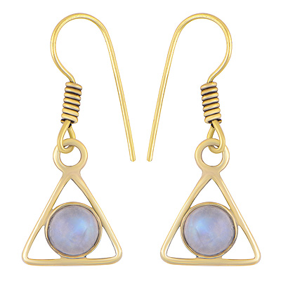 Home | Fashion Earrings | Brass Gemstone Earrings | Gorgeous Triangle Plain Wair Around Rainbow Moonstone Round Shape Solid Brass Dangle Earrings