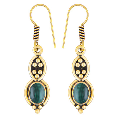 Home | Fashion Earrings | Brass Gemstone Earrings | Stunning Oxidised Rawa Work Around Malachite Oval Shape Solid Brass Dangle Earrings