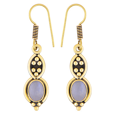 Home | Fashion Earrings | Brass Gemstone Earrings | Stunning Oxidised Rawa Work Around Rainbow Moonstone Oval Shape Solid Brass Dangle Earrings