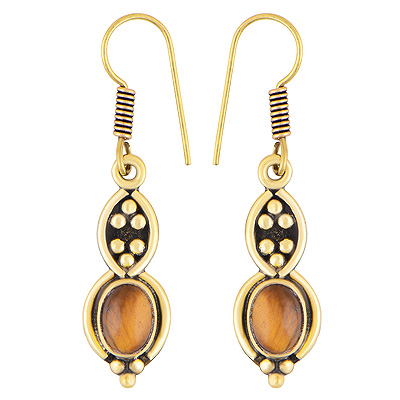 Home | Fashion Earrings | Brass Gemstone Earrings | Stunning Oxidised Rawa Work Around Tiger's Eye Oval Shape Solid Brass Dangle Earrings