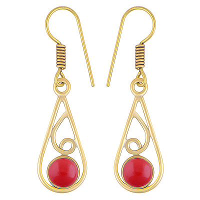 Home | Fashion Earrings | Brass Gemstone Earrings | Beautiful Wire Pattern Around Coral Round Shape Solid Brass Dangle Earrings