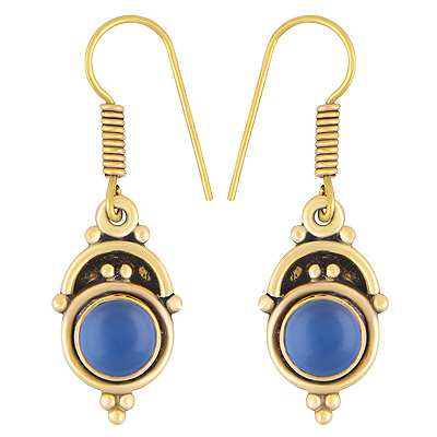 Home | Fashion Earrings | Brass Gemstone Earrings | Alluring Oxidised Rawa Work Around Blue Chalcedony Round Shape Solid Brass Dangle Earrings