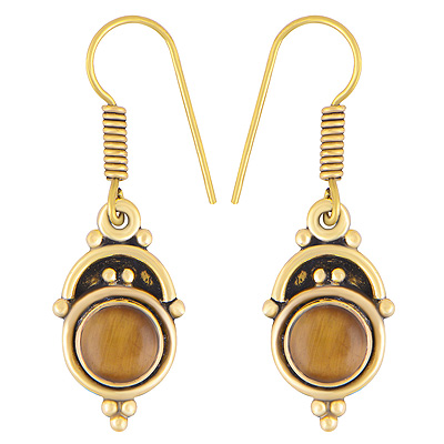 Home | Fashion Earrings | Brass Gemstone Earrings | Alluring Oxidised Rawa Work Around Tiger's Eye Round Shape Solid Brass Dangle Earrings