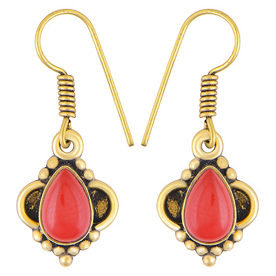 Home | Fashion Earrings | Brass Gemstone Earrings | Stunning Handcrafted Rawa Work Around Coral Pear Shape Solid Brass Dangle Earrings