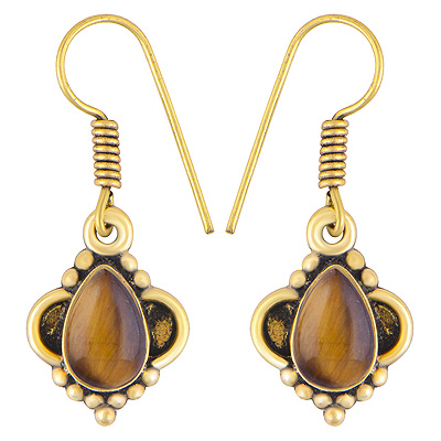 Home | Fashion Earrings | Brass Gemstone Earrings | Stunning Handcrafted Rawa Work Around Tiger's Eye Pear Shape Solid Brass Dangle Earrings