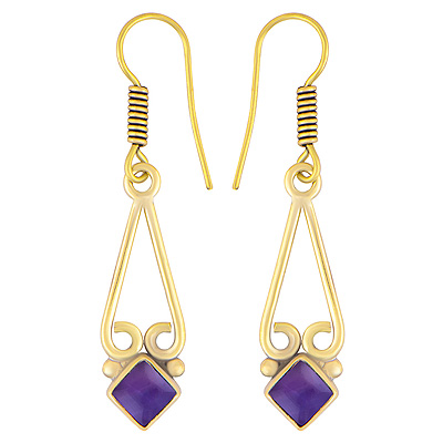Home | Fashion Earrings | Brass Gemstone Earrings | Beautiful Wire Work Around Amethyst Square Shape Solid Brass Dangle Earrings
