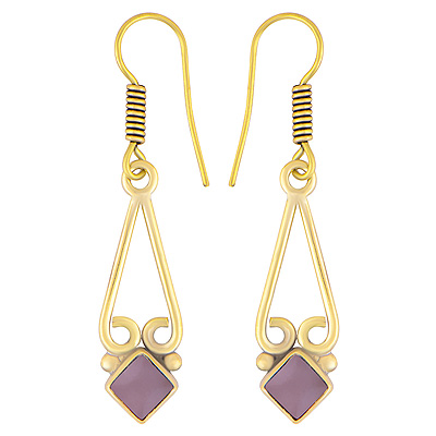Home | Fashion Earrings | Brass Gemstone Earrings | Beautiful Wire Work Around Rose Quartz Square Shape Solid Brass Dangle Earrings