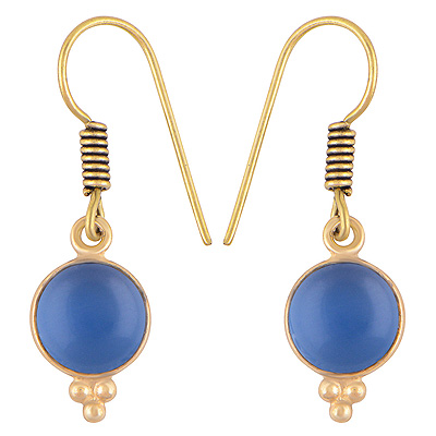 Home | Fashion Earrings | Brass Gemstone Earrings | Gorgeous Minimal Rawa Work Around Bezel Blue Chalcedony Round Shape Solid Brass Dangle Earrings