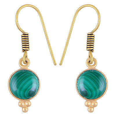 Home | Fashion Earrings | Brass Gemstone Earrings | Gorgeous Minimal Rawa Work Around Bezel Malachite Round Shape Solid Brass Dangle Earrings