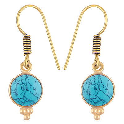 Home | Fashion Earrings | Brass Gemstone Earrings | Gorgeous Minimal Rawa Work Around Bezel Turquoise Round Shape Solid Brass Dangle Earrings