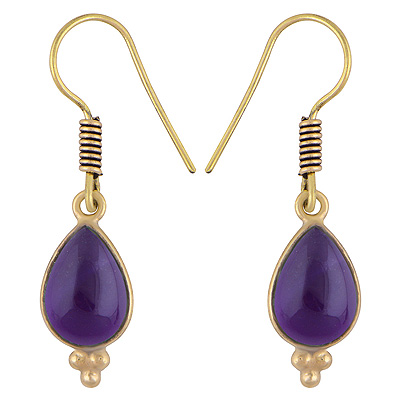Home | Fashion Earrings | Brass Gemstone Earrings | Beautifully Handmade Bezel Rawa Work At Bottom Amethyst Pear Shape Solid Brass Dangle Earrings