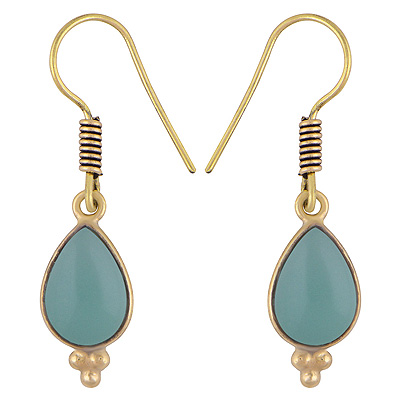 Home | Fashion Earrings | Brass Gemstone Earrings | Beautifully Handmade Bezel Rawa Work At Bottom Aqua Chalcedony Pear Shape Solid Brass Dangle Earrings