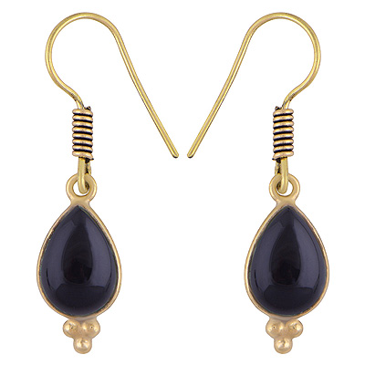 Home | Fashion Earrings | Brass Gemstone Earrings | Beautifully Handmade Bezel Rawa Work At Bottom Black Onyx Pear Shape Solid Brass Dangle Earrings
