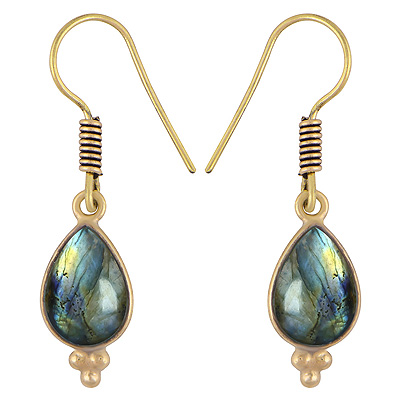 Home | Fashion Earrings | Brass Gemstone Earrings | Beautifully Handmade Bezel Rawa Work At Bottom Labradorite Pear Shape Solid Brass Dangle Earrings