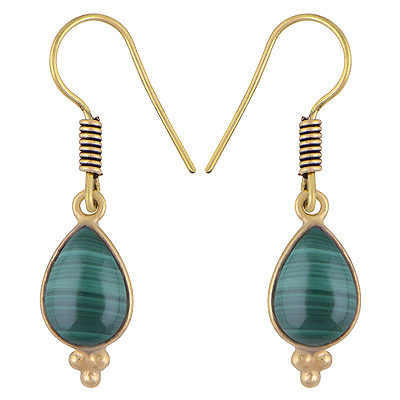 Home | Fashion Earrings | Brass Gemstone Earrings | Beautifully Handmade Bezel Rawa Work At Bottom Malachite Pear Shape Solid Brass Dangle Earrings