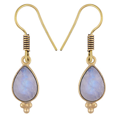 Home | Fashion Earrings | Brass Gemstone Earrings | Beautifully Handmade Bezel Rawa Work At Bottom Rainbow Moonstone Pear Shape Solid Brass Dangle Earrings