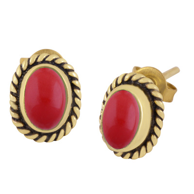 Home | Fashion Earrings | Brass Gemstone Studs | Authentic Wire Work Around Coral Oval Shape Solid Brass Studs Earrings