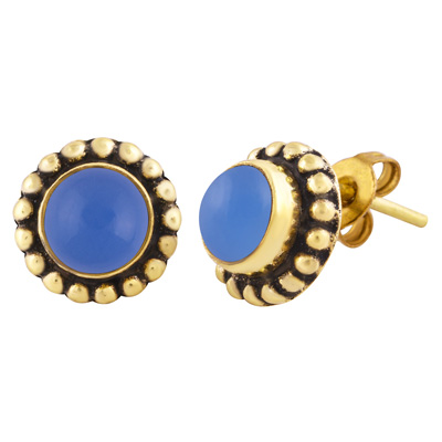 Home | Fashion Earrings | Brass Gemstone Studs | Classic Rawa Work Around Blue Chalcedony Round Shape Solid Brass Studs Earrings