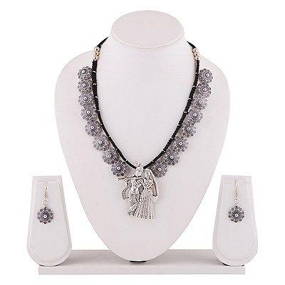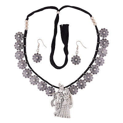 Home | Fashion Jewellery Sets | German Silver Gemstone Sets | Stunning Lord Radha Krishna w/ flowers Around Plain German Silver Jewellery Necklaces Sets