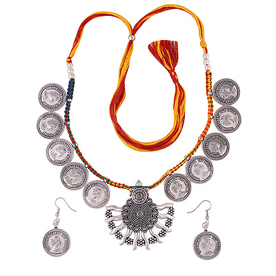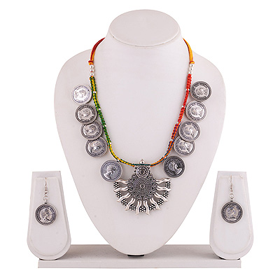 Home | Fashion Jewellery Sets | German Silver Gemstone Sets | Gorgeous Queen Elizabeth Embossed Around Plain German Silver Jewellery Necklaces Sets