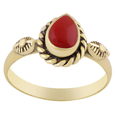Stunning Textured Leaf Around Coral Pear Shape Solid Brass Ring