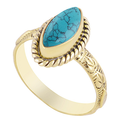 Beautiful Embossed Work Texture Band Around Turquoise Marquise Shape Solid Brass Ring