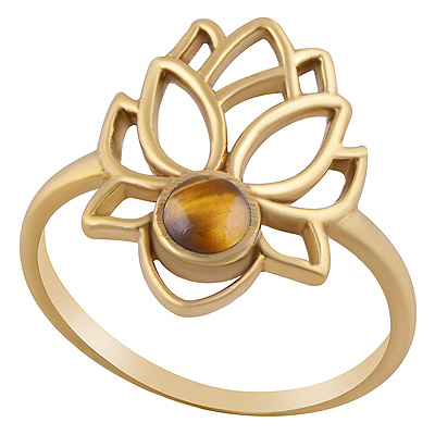 Beautiful Lotus Flower Around Tiger's Eye Round Shape Solid Brass Ring