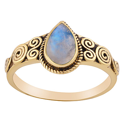 Home | Fashion Rings | Brass Gemstone Rings | Gorgeous Spiral Patterns Around Rainbow Moonstone Pear Shape Solid Brass Ring