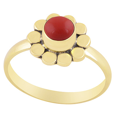 Home | Fashion Rings | Brass Gemstone Rings | Alluring Coin Work Around Coral Round Shape Solid Brass Ring