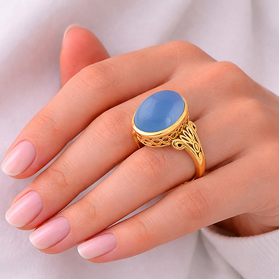 Alluring Shank W/ Texture Work Around Blue Chalcedony Oval Shape Solid Brass Men's Ring