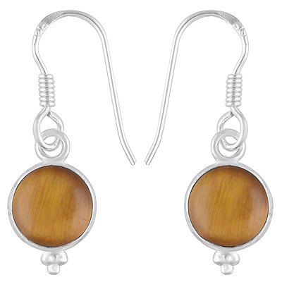 Home | Silver Earrings | Cabochon Earrings | Gorgeous Rawa Work at Bottom Bezel Tiger's Eye Round Shape 925 Sterling Solid Silver Dangle Earrings