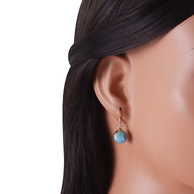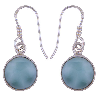 Home | Silver Earrings | Cabochon Earrings | Plain Collet Natural Larimar Round Shape 925 Sterling Solid Silver Dangle Earrings