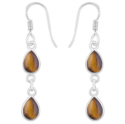 Home | Silver Earrings | Cabochon Earrings | Beautiful Two Stone Bezel Tiger's Eye Pear Shape 925 Sterling Solid Silver Dangle Earrings