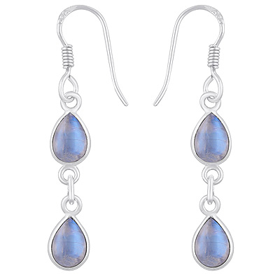 Home | Silver Earrings | Cabochon Earrings | Beautiful Two Stone Bezel Rainbow Moonstone Pear Shape 925 Sterling Solid Silver Dangle Earrings