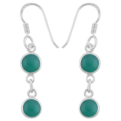 Home | Silver Earrings | Cabochon Earrings | Gorgeous Two Stone Bezel Green Onyx Round Shape 925 Sterling Solid Silver Dangle Earrings